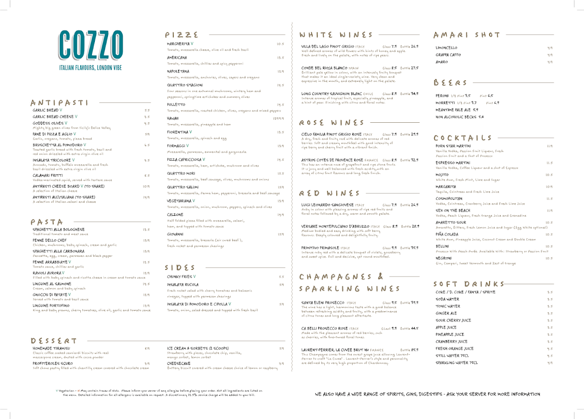 The Cozzo Italian Restaurant Menu features a variety of traditional Italian dishes, with something to satisfy every palate. From their perfectly crafted Margherita Pizza, with a thin, crispy base and just the right amount of mozzarella and basil, to their rich and creamy Risotto alla Milanese, made with saffron and the finest Parmesan, the menu showcases authentic ingredients that transport diners straight to Italy. The restaurant's pasta options are also standout, with the Tagliatelle Bolognese offering a hearty, flavorful sauce paired with freshly made pasta. For those seeking something lighter, the Caprese Salad with ripe tomatoes, fresh mozzarella, and basil is the perfect choice.